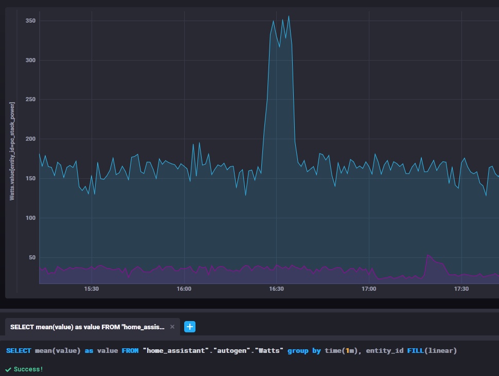 SELECT mean(value) as value FROM "home_assistant"."autogen"."Watts" group by time(1m), entity_id FILL(linear)
