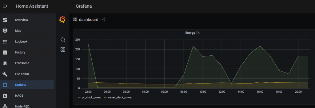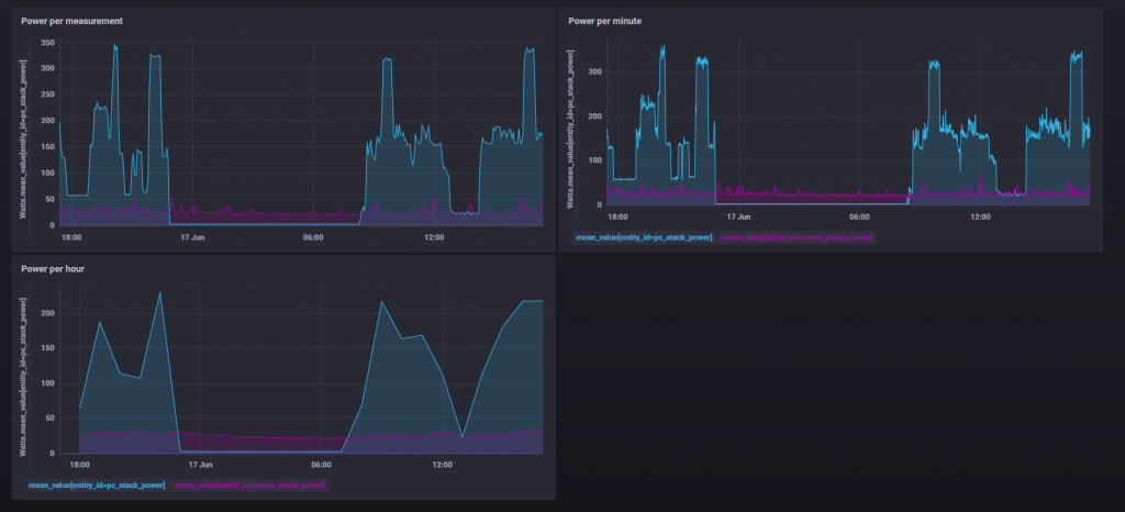 SELECT mean("value") AS "mean_value" FROM "home_assistant"."infinite"."Watts" WHERE time > :dashboardTime: AND time < :upperDashboardTime: AND ("entity_id"='pc_stack_power' OR "entity_id"='server_stack_power') GROUP BY time(1h), "entity_id" FILL(previous)
