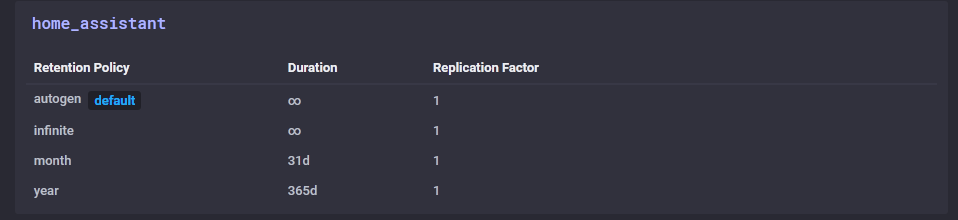CREATE RETENTION POLICY "month" ON "home_assistant" DURATION 31d REPLICATION 1 DEFAULT
