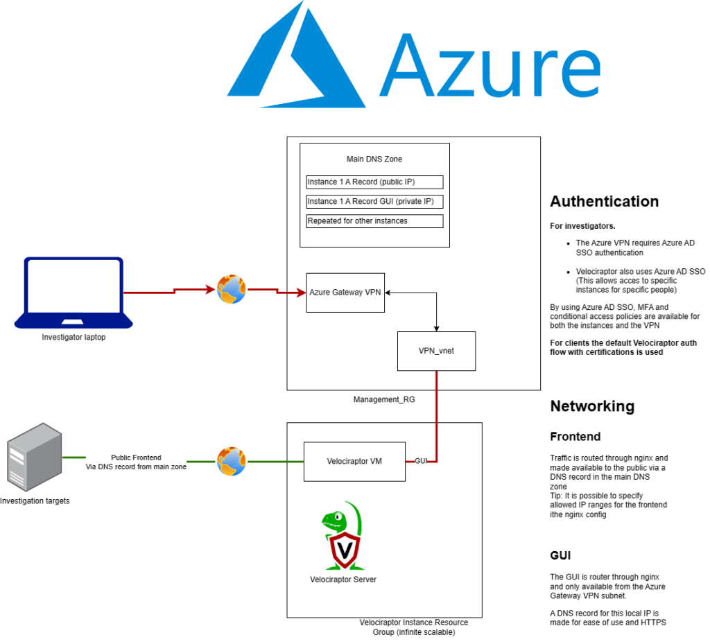 This blog is split up into a few sections: (Dont know this yet, will type and reorder probably). Firstly I’ll start with the plan for the infrastructure, then I’ll walk you through the files which are used for the deployment. After a VM is deployed, it needs to be provisioned and Velociraptor should be configured, which will i describe in the second part of this blog.