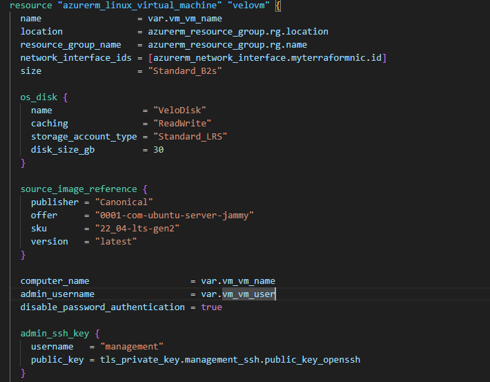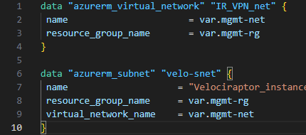 We still need some networking for the rest. In this file, we define a public IP for the velociraptor VM to be reachable on. Also, a NIC will be created which will add the connection to the VPN Subnet discussed earlier. In this file, the network security groups defined in netsec.tf are linked to the NIC