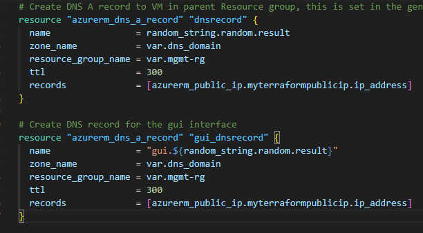 Surprise, this file does stuff with DNS. It will create an A record in the DNS Zone of the persistent Management Resource group for both the GUI and Frontend Subdomain. Both will be linked to the public IP at this time. The reasoning behind this is that in order for LetsEncrypt to generate certificates, a DNS check will be done. After the certificates have been generated (in the provisioning step) the GUI IP will be changed to the internal IP