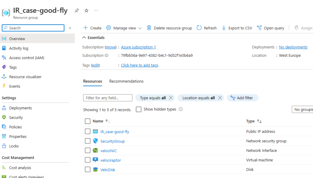 With this information, a resource group is created with the name IR_<random pet>. Inside this Resource group, a VM is deployed with the tiering, image, and disk size as described above. It’s very awesome that you can define stuff like username, computer name, and even a public key at this phase. So we make use of that.