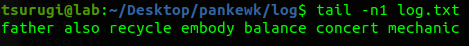 Log entries fill up from top to bottom, so the most recent entry is the last line in the log file we observed in file 5. The last line(s) of a log file can also be obtained by tail -n1 log.txt
