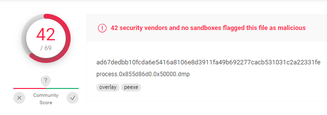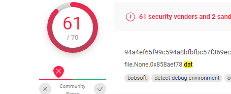 Looking up the hash in VirusTotal gives us a 60/68 detection: