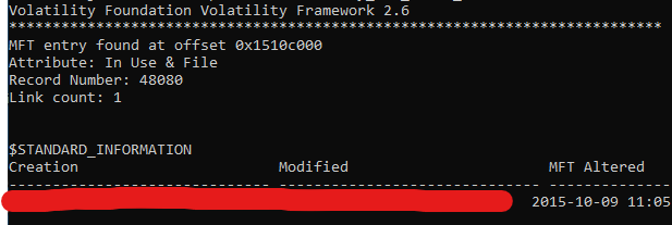 `> volatility_2.6_win64_standalone.exe -f C:\Users\johndoe\Desktop\Challenges\target1\Target1-1dd8701f.vmss --profile Win7SP1x86_23418 mftparser --output=body -D C:\Users\johndoe\Desktop\Challenges\target1\vola\mft --output-file=mft.body`